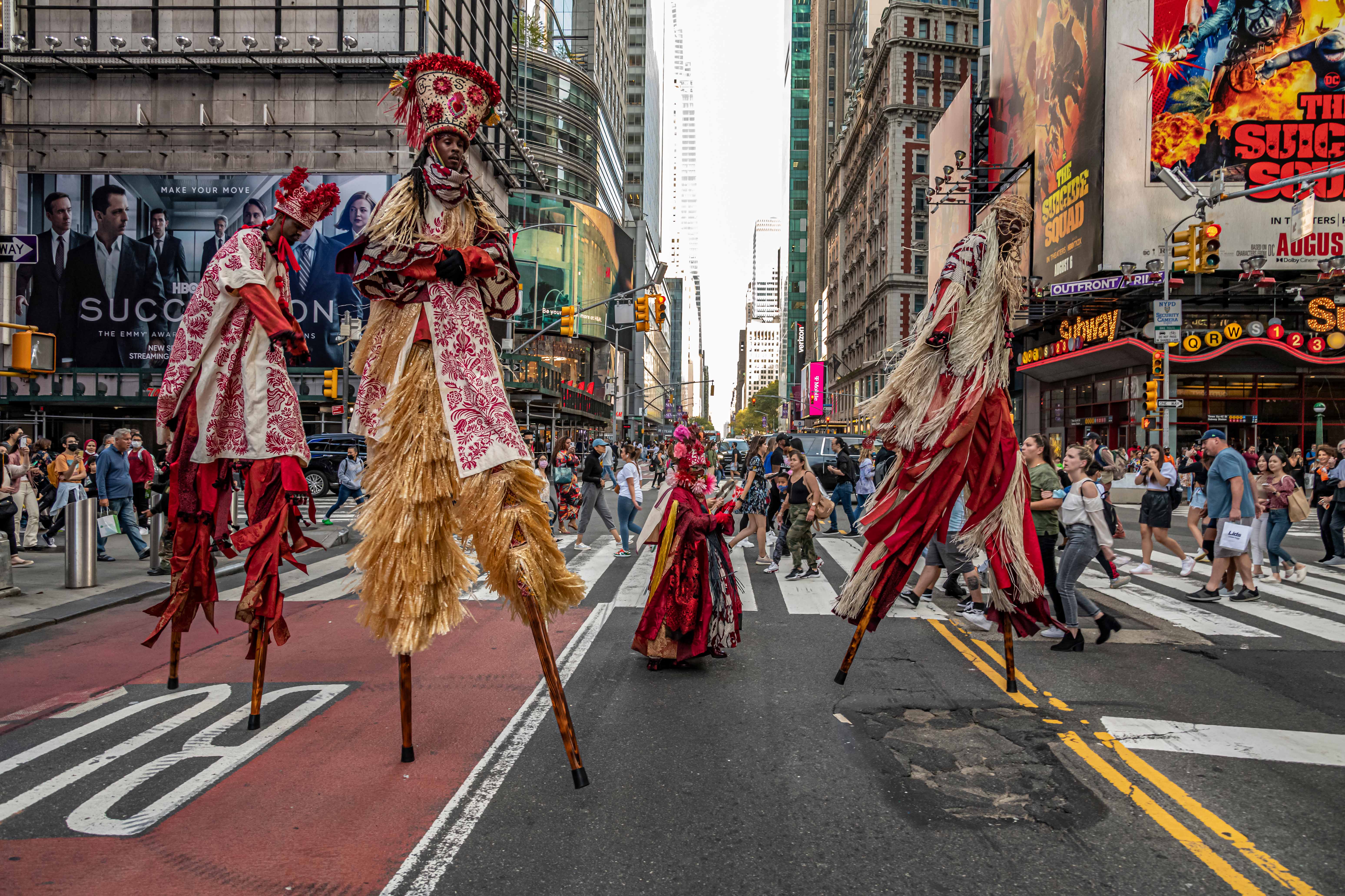 Con trajes diseñados por la artista, los dos primeros grupos están integrados por bailarines tradicionales sobre zancos. Otros artistas y músicos los acompañarán para crear una obra que articula elementos de danza, procesión, performance, música y ritual, y que fomenta la participación de los espectadores.